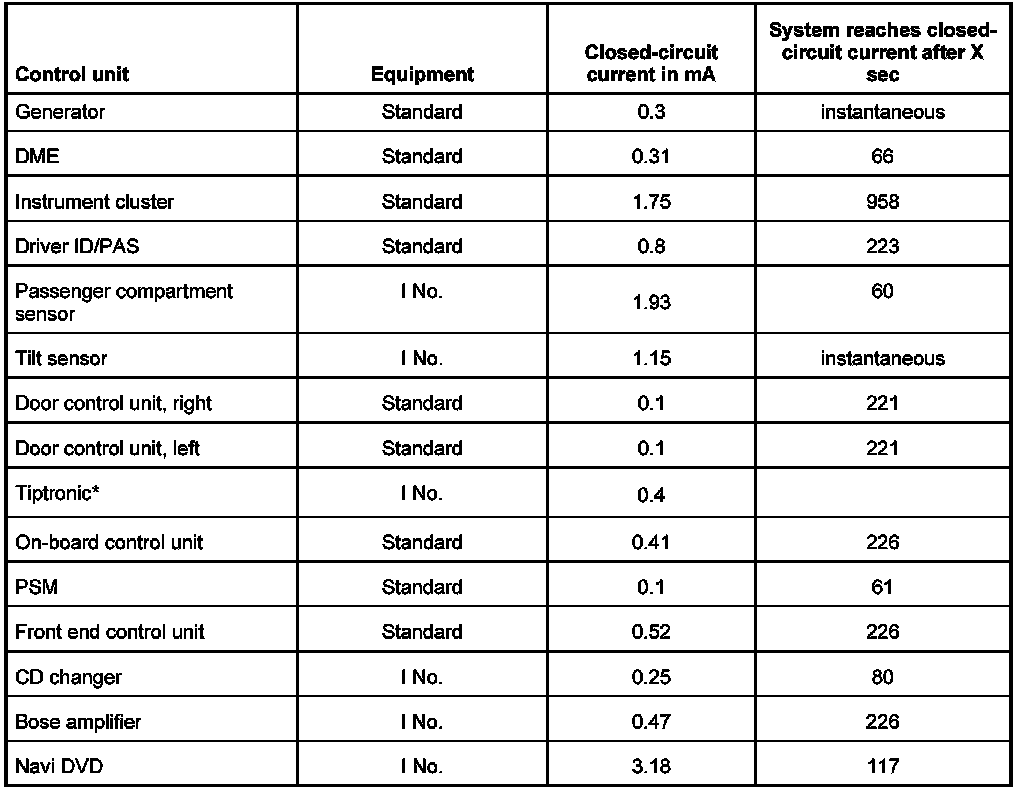 INFORMATION: Before measuring the closed-circuit current, determine the vehicle equipment (I numbers) and establish the expected closed-circuit current with the aid of the attached table.
