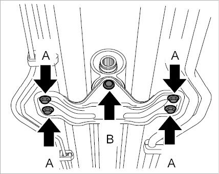 Never loosen screw on transmission mount -B-.