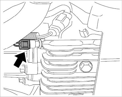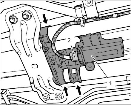 Press on grab handles -arrows- on the coolant pipes and connect cable plug -2-. Slide the pipe holder -1- back until it engages on the support for final drive.