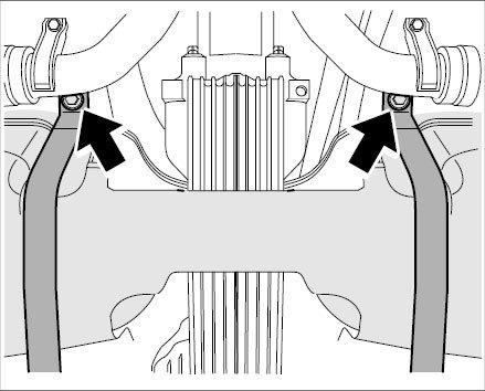 Carefully guide the front final drive into position from below. Avoid damaging the coolant pipes when doing so.