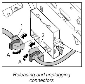 4. Release both electrical connectors -1, 2- -A- and unplug them from the control unit.