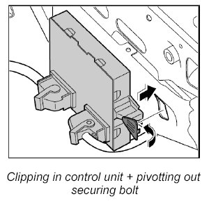 3. Clip in control unit on the support for the steering wiring and engage the locking mechanism for the lock.