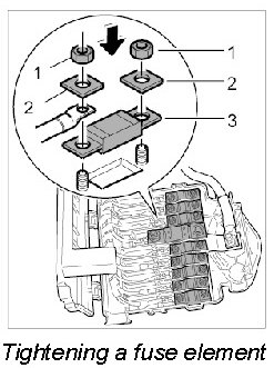 3. Place the fuse element -3- into position, fit the washer -2- and secure with the fastening nuts -1-. - Tightening torque: M6>>8 Nm (6 ftlb.) - Tightening torque: M8>>15 Nm (11 ftlb.)