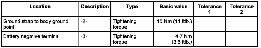 6. Fit ground strap for the negative terminal on the battery and screw it on securely -3-. - Tightening torque: 4.7 Nm (3.5 ftlb.)