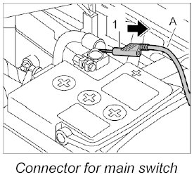 1. Pull off the B+ plug -1- for the main switch (battery disconnect switch) from the battery positive terminal.
