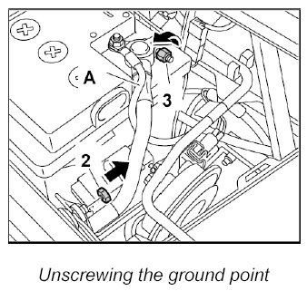 2. Unscrew the fastening nut -2- for the ground point on the body and disconnect the negative terminal -3- from the battery.