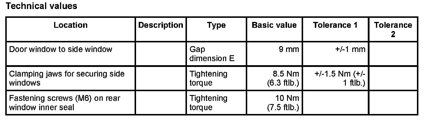 2. Tighten fastening nuts -arrows- on clamping jaws to secure side window. Tightening torque: 8.5 Nm (6.3 ftlb.)±1.5 Nm (±1 ftlb.)