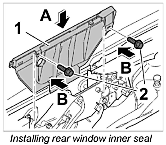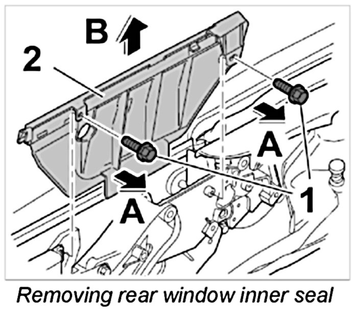1. Undo front and rear fastening screws -1- from the convertible top support and the belt guide section -arrows A-, and pull rear window inner seal -2- up and out -arrow B-.