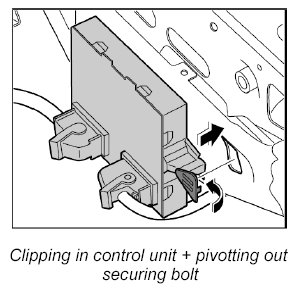 3. Clip in control unit on the support for the steering wiring and engage the locking mechanism for the lock.