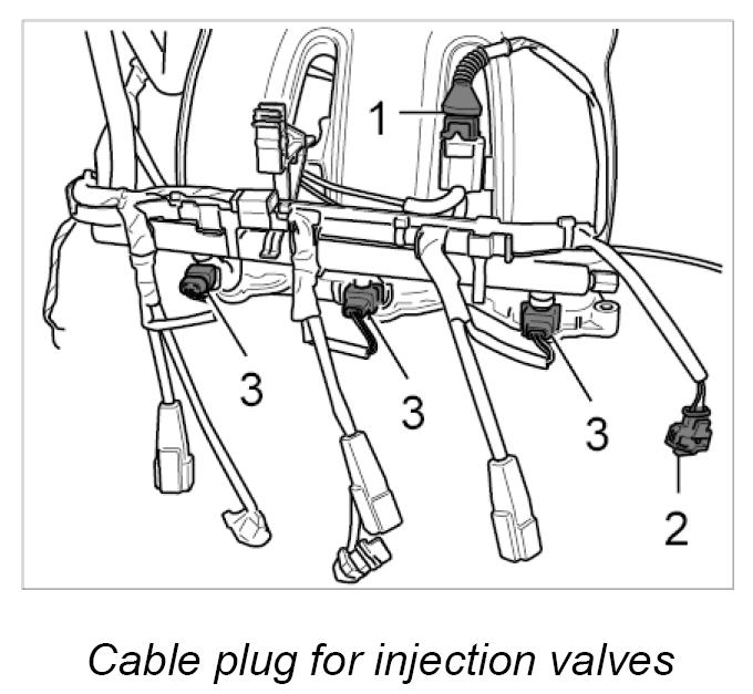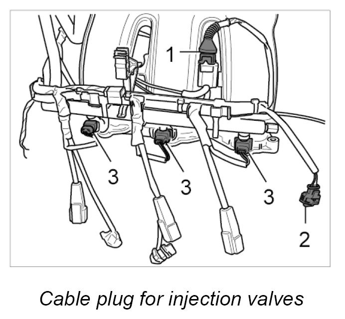 3. Remove plastic lines from cable holder over the fuel distributor pipe -1- and pull cable holder up and off.