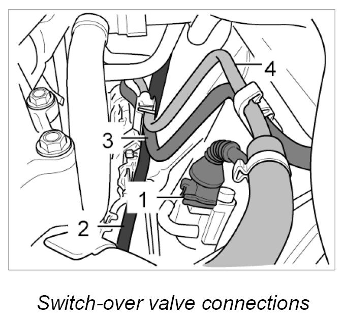 6. Remove cable plug from switch-over valve -3-. Pull vacuum pipes off the switch-over valve -4-.