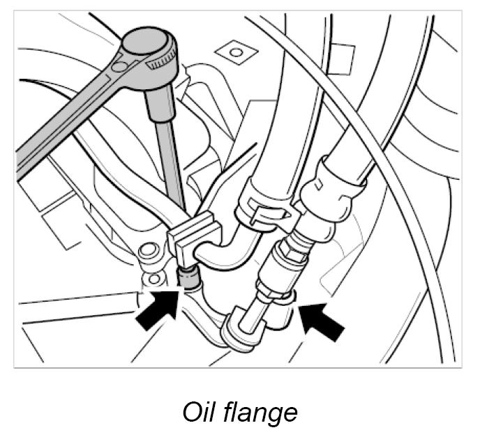 9. Unscrew the two fastening screws of the oil flange behind the servo oil lines and remove the oil flange -arrows-. Replace seal.