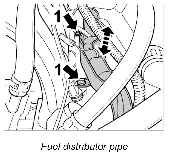 8. Remove fastening screws for fuel distributor pipe -1- and pull fuel distributor pipe together with fitted injection valves from the intake distributor. Check sealing rings of injection valves and replace if necessary.