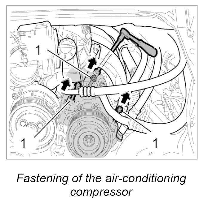 6. Lift out the air-conditioning compressor with the leads connected and lay to one side on a protective support. Secure additionally with a tie-wrap.