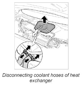 1. Release the two top fastening clamps for the coolant hoses of the heat exchanger and slide them back over the hoses.