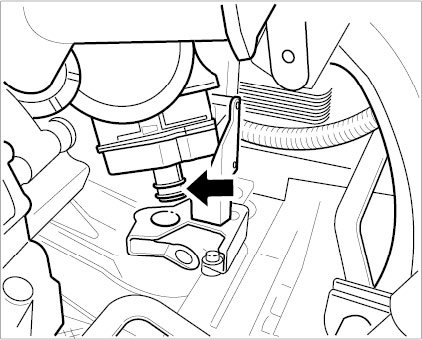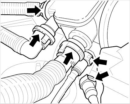 13. Remove connections to the oil separator. For this purpose, place a cloth underneath as coolant emerges from the bottom vent line. Press and remove the connections -arrows-. Remove oil separator from the engine compartment.