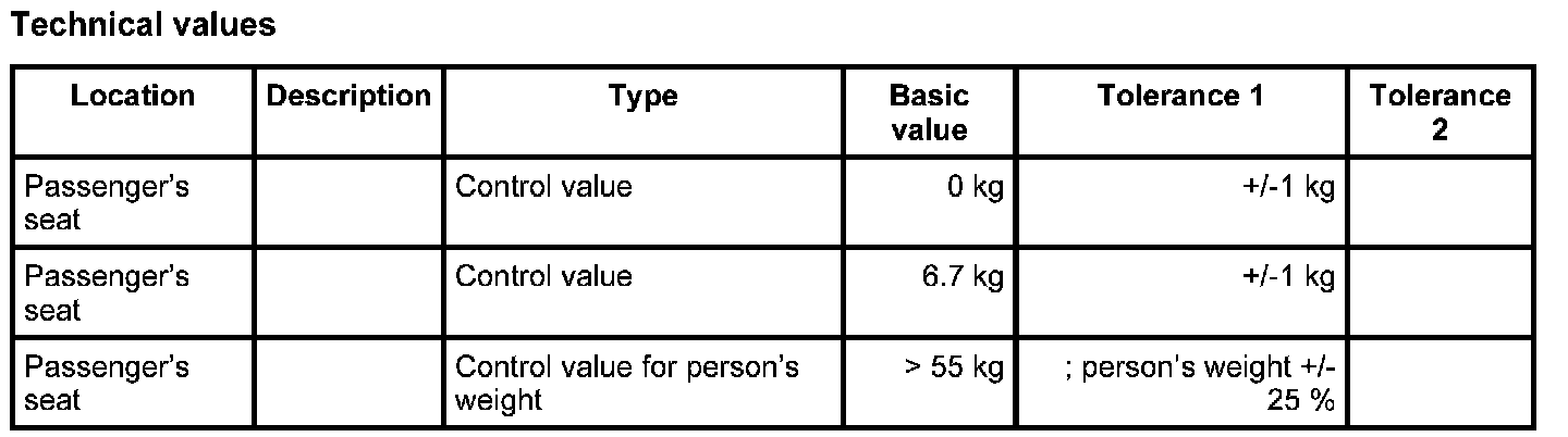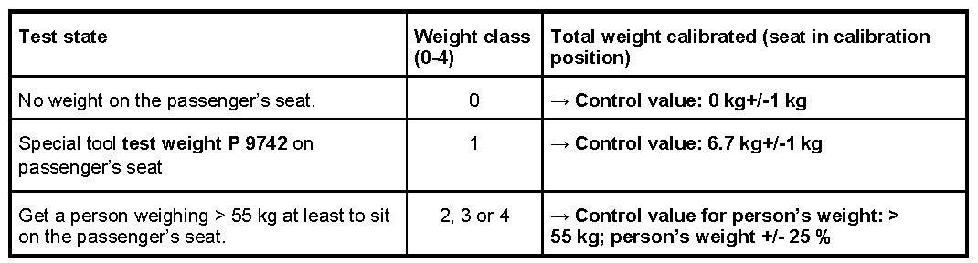 10.1.1. If there is no weight on the passenger's seat, compare values (see table below) using the PIWIS Tester. The Passenger Airbag Off indicator light in the centre console must not come on.