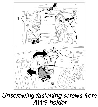 3. Release electric connector on AWS control unit -a-, unplug and tilt the AWS holder to the right side.