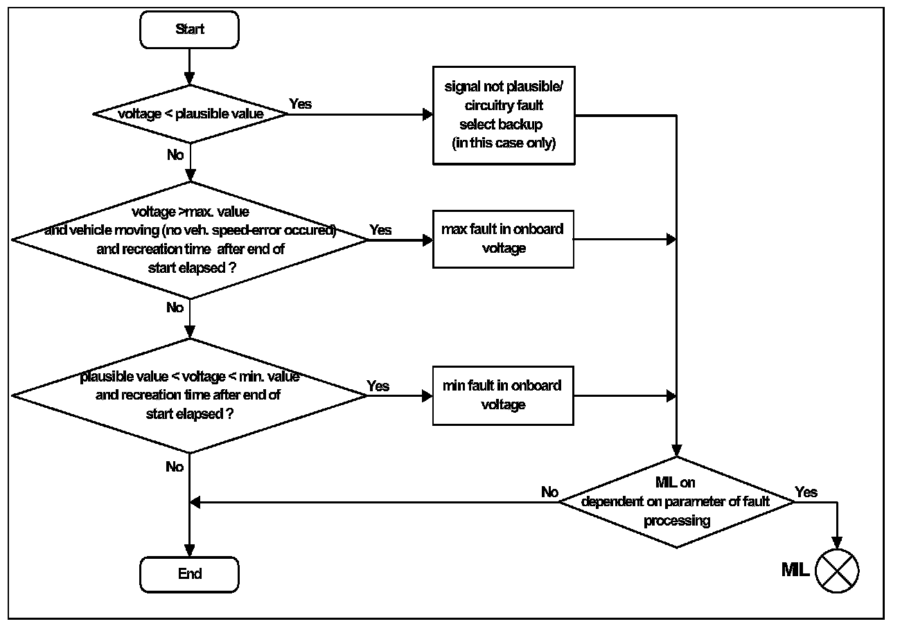 The check of the min. value (fault in the vehicle's electrical power supply system) is only allowed after a delay time from the end-of-start, when the voltage has recovered from the starter activation.