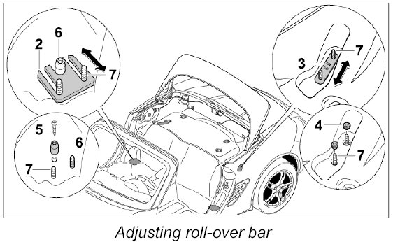 1. Adjustment procedure: Loosen fastening nuts at the roll-over bar attachment points at the front and rear.