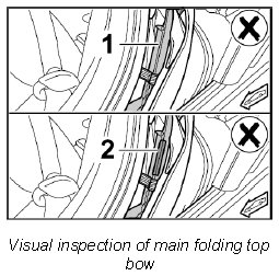 Perform a visual inspection of the main folding top bow at the left and right.