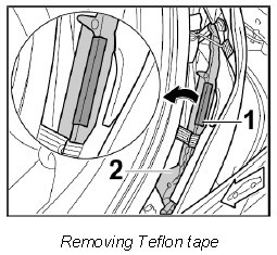 4. Pull Teflon tape -1- off the main folding top bow -2- under the cross strut -arrow-.