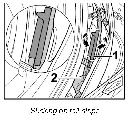 6. Affix felt strip -1- to the main folding top bow -2- under the cross strut ensuring that there are no air bubbles -arrows- and press it on.