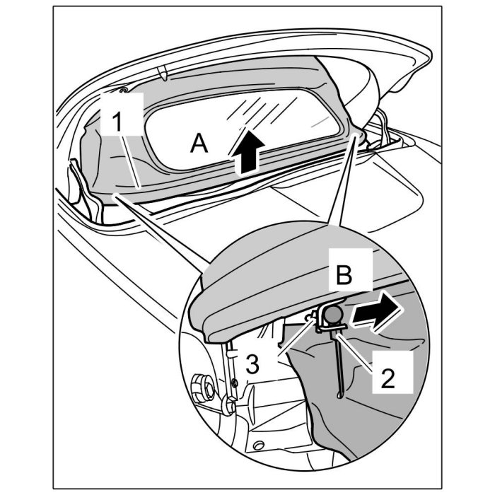 5. Raise convertible top -1- slightly at the rear -Arrow A-. Press the ball socket of the left and right tension cables -2- out of the ball head of the adjusting piece -3- ( -Arrow B- ).