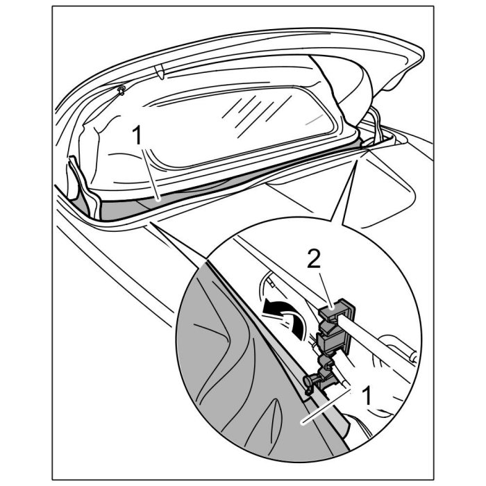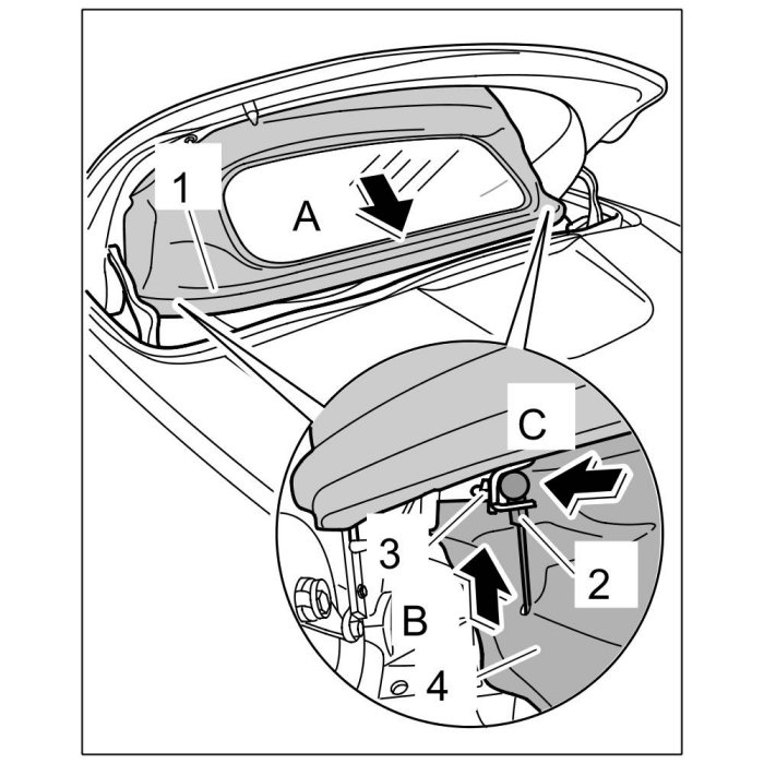 2. Swivel convertible top -1- down slightly at the rear ( -Arrow A- ). Pull tension cables -2- at the left and right through the cloth covering -4- ( -Arrow B- ) and press ball socket in at the adjusting piece -3- ( -Arrow C- ).