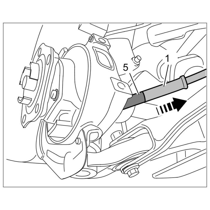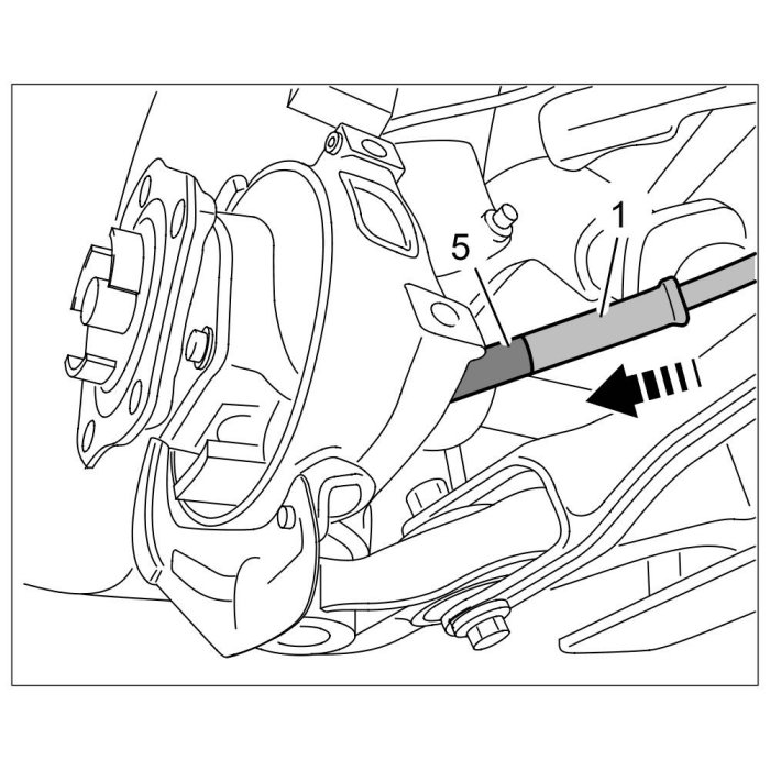5.1. Pull brake cables -1- out of the guide tubes -5- at the wheel bearing housing -arrow-.
