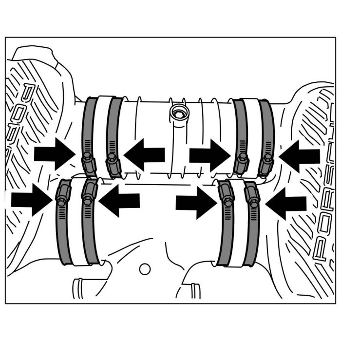 1. Join intake-air distributor with the rubber sleeves, then position and tighten the screw-type hose clamps -arrows-.
