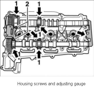 13. Screw the housing screws of the inlet and exhaust camshafts and the auxiliary screw of the adjustment gauge alternately by approximately another 90° until the specified tightening torque is reached. Tightening torque: 7.5 ft lb.; Tightening torque: 17 ft lb.