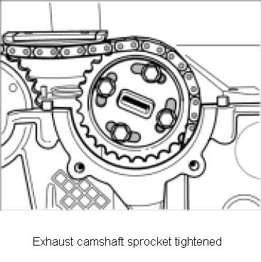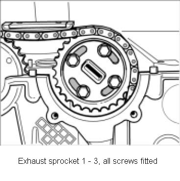 17. Insert four Torx screws M6 to sprocket of exhaust camshaft and tighten evenly in diagonally opposite sequence. Tightening torque: 10.5 ft lb.