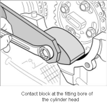 18. Tighten the central screw of the camshaft adjusting device. Fit special tool retaining tool 9685 on hexagon of intermediate piece of the central screw. Screw in the central screw gently by hand so that the loose contact block just touches the fitting bore of the oil suction pump. Fix the hexagon-head bolt to the contact block.