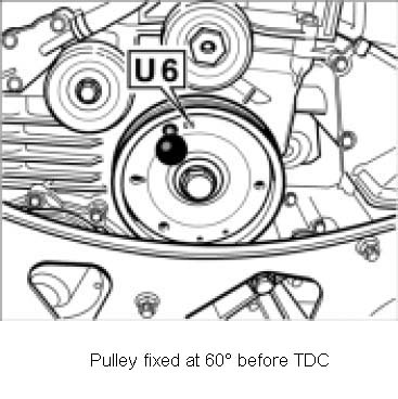 1. To remove the play from the timing chain drive, turn the crankshaft by means of the pulley or vibration balancer clockwise (running direction of engine to 60° before TDC : marking U6 on pulley or vibration balancer coincides with fixing bore in crankcase. Fix with locating pin 9595/1.