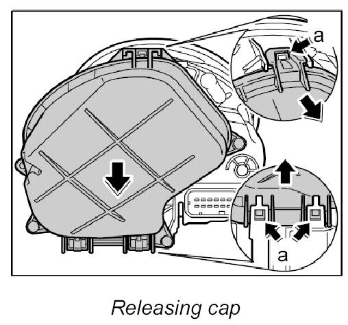 2. Release cap once at the top and twice at the bottom -a- and remove from the main headlight.