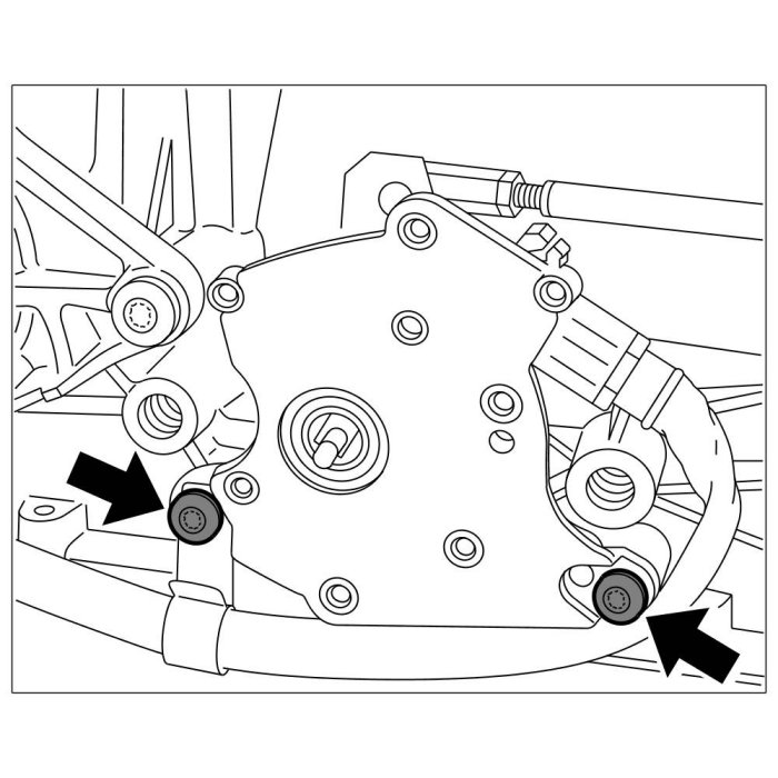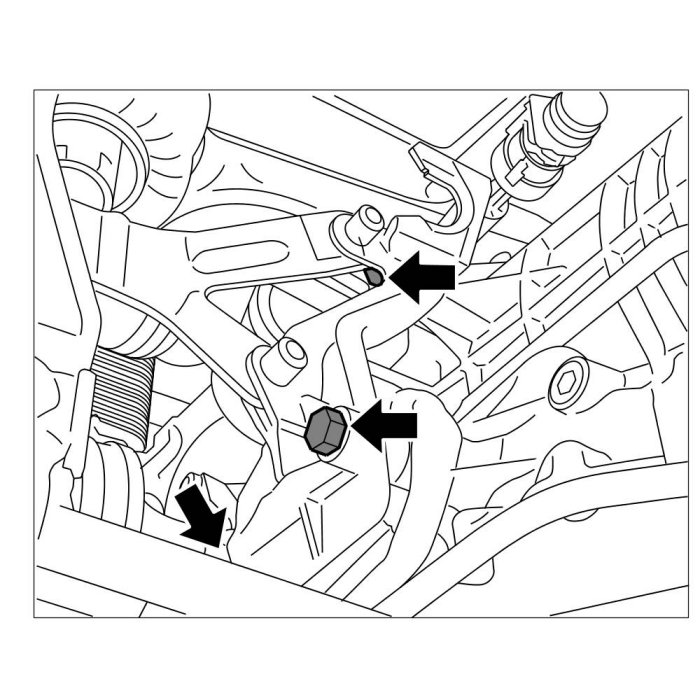 5. Screw in fastening screws between the body and the hydraulic mount -arrows-.