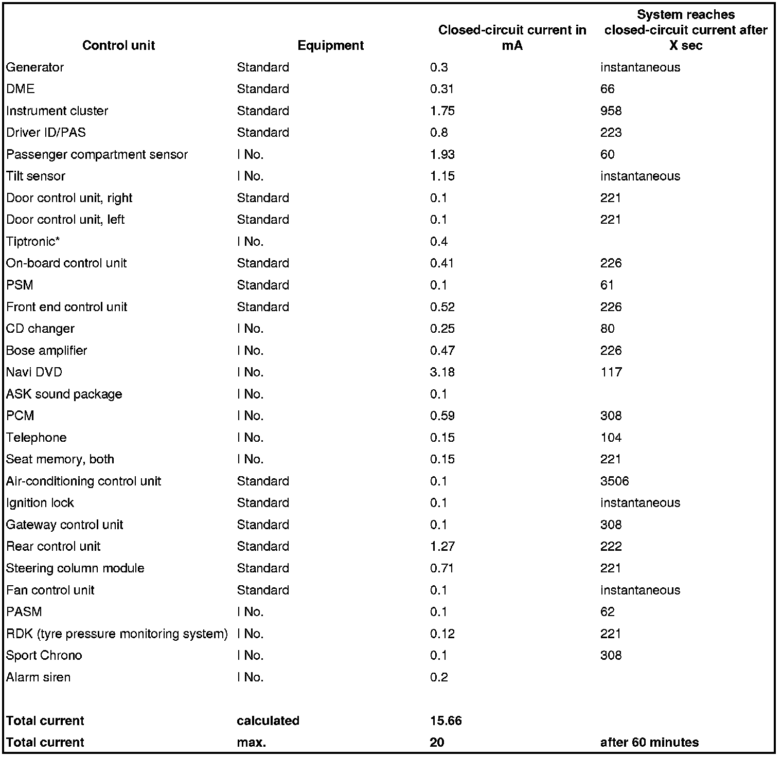 Before measuring the closed-circuit current, determine the vehicle equipment (I numbers) and establish the expected closed-circuit current with the aid of the attached table.