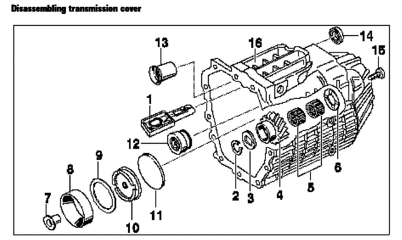 5. Fit transmission cover -16-. To do this, coat cover sealing surfaces lightly with Loctite 574 and screw in Torx screws.
