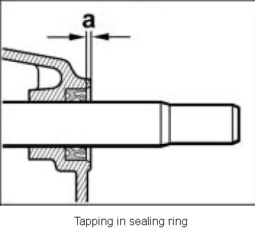 1. Fill the shaft seal -14- between the dust and sealing lips with multipurpose grease and drive in with a suitable tubular piece (e.g. vw 423). Observe the correct drive-in depth -a = 1 mm-.