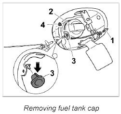 1. Press out plastic pin in centre of rivet head -1- and remove fuel tank cap -2-. Then unclip rubber stop -3- and rubber sleeve -4-.