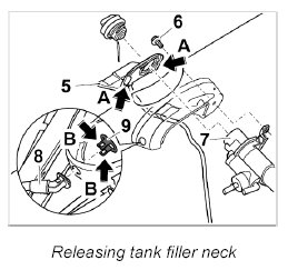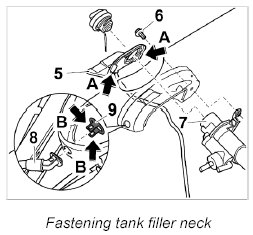 2. Unscrew fastening screw -6- of tank filler neck -7-.