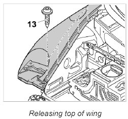 1. Unscrew fastening screws -18- at A-pillar and pull wing out -19- downwards -C- and forwards -D-.