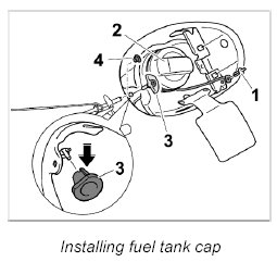 1. Press in plastic expansion rivet -1- on fuel tank cap -2-. Then clip in rubber stop -3- and rubber sleeve -4-