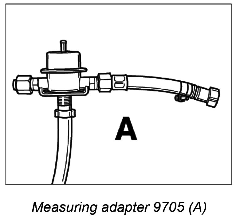 8. Connect the measuring adapter 9705 special tool to the rapid-action coupling on the fuel line. Make sure that the plug-in coupling is fitted correctly (must engage audibly) by pulling the line apart.