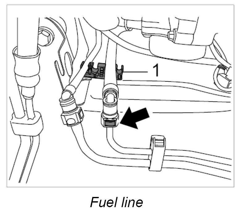 7. Disconnect rapid-action coupling on the fuel supply line -1- by pressing in the locking lug and pulling off the coupling. Clean up emerging residual fuel with a cloth, for example.