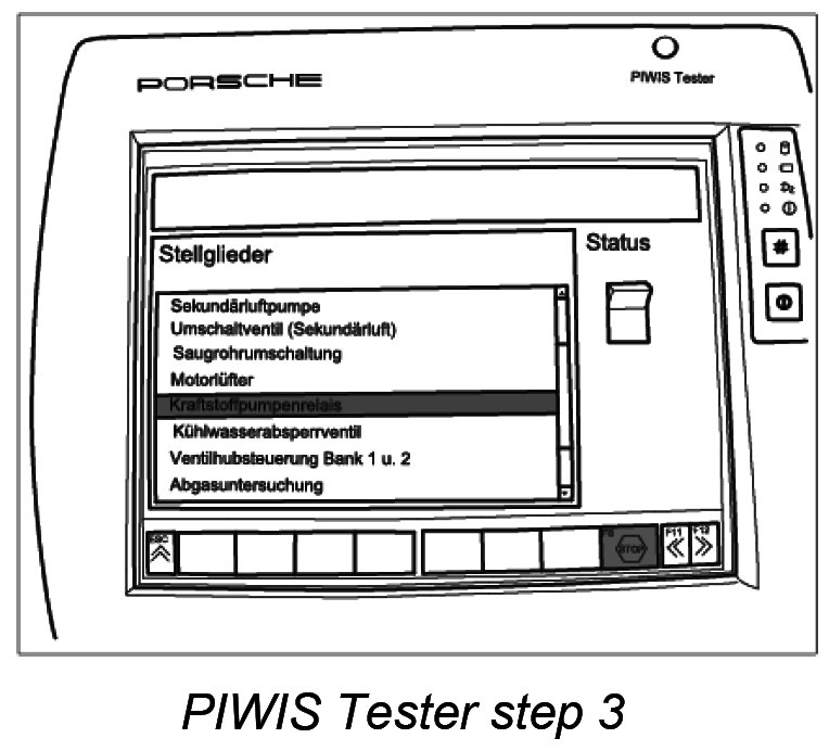 3. Connect the Porsche PIWIS Tester PIWIS Tester 9718 to the input socket in the vehicle using the adapter lead, switch on the ignition and switch off all loads, such as the radio and air conditioning. Switch on the Tester and select the vehicle (option: Diagnostics).