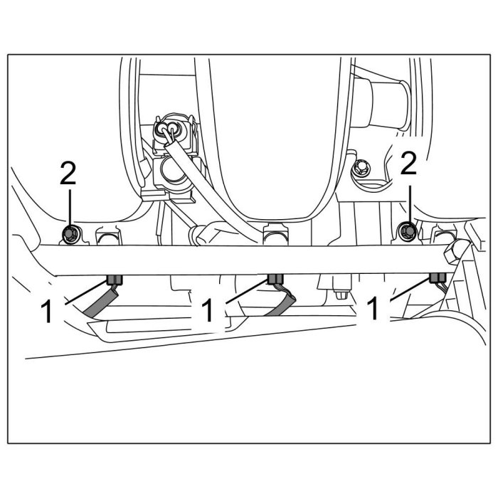 7. Secure fuel gallery with two Torx screws (M6 x 12) -2-. => Tightening torque: 7.5 ftlb.