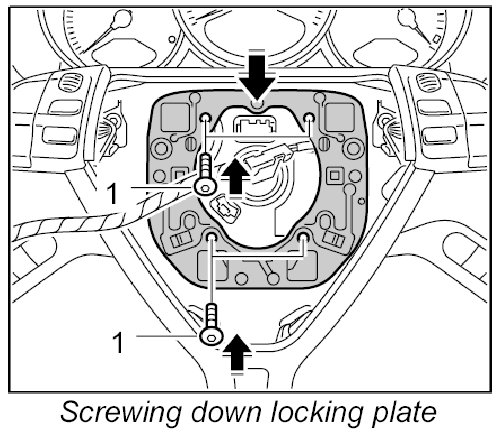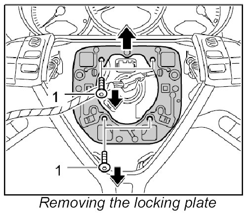 1. Unscrew the four fastening screws -1- from the locking plate in the steering wheel and remove along with the locking plate.