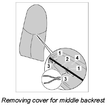 2. Cut through cushion clips -1- using side cutters. Detach piping -2- for cover for middle backrest and remove plastic frame -3- from the padding -4-.